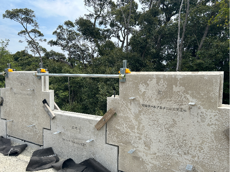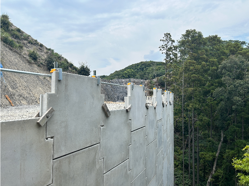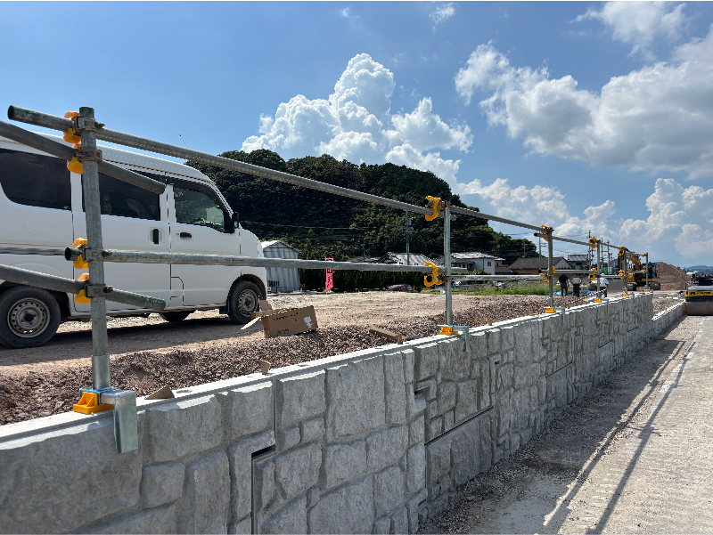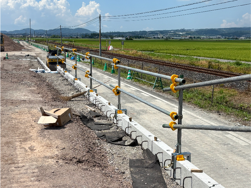 垂直擁壁施工中の落下防止・安全対策用手すりホルダーです。
